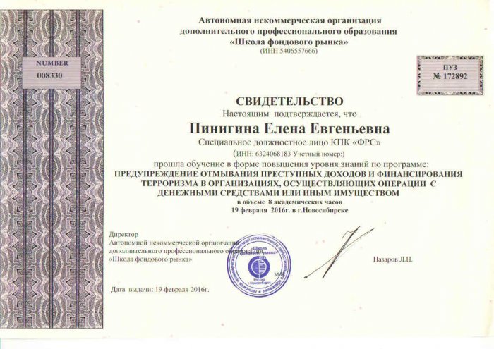 Свидетельство Школа фондового рынка 2016